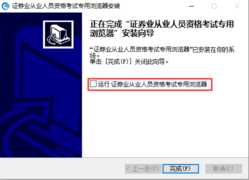安装完成后弹出对话框,将复选框勾掉,然后点击完成,完成“证券业从业人员资格考试专用浏览器”的安装。